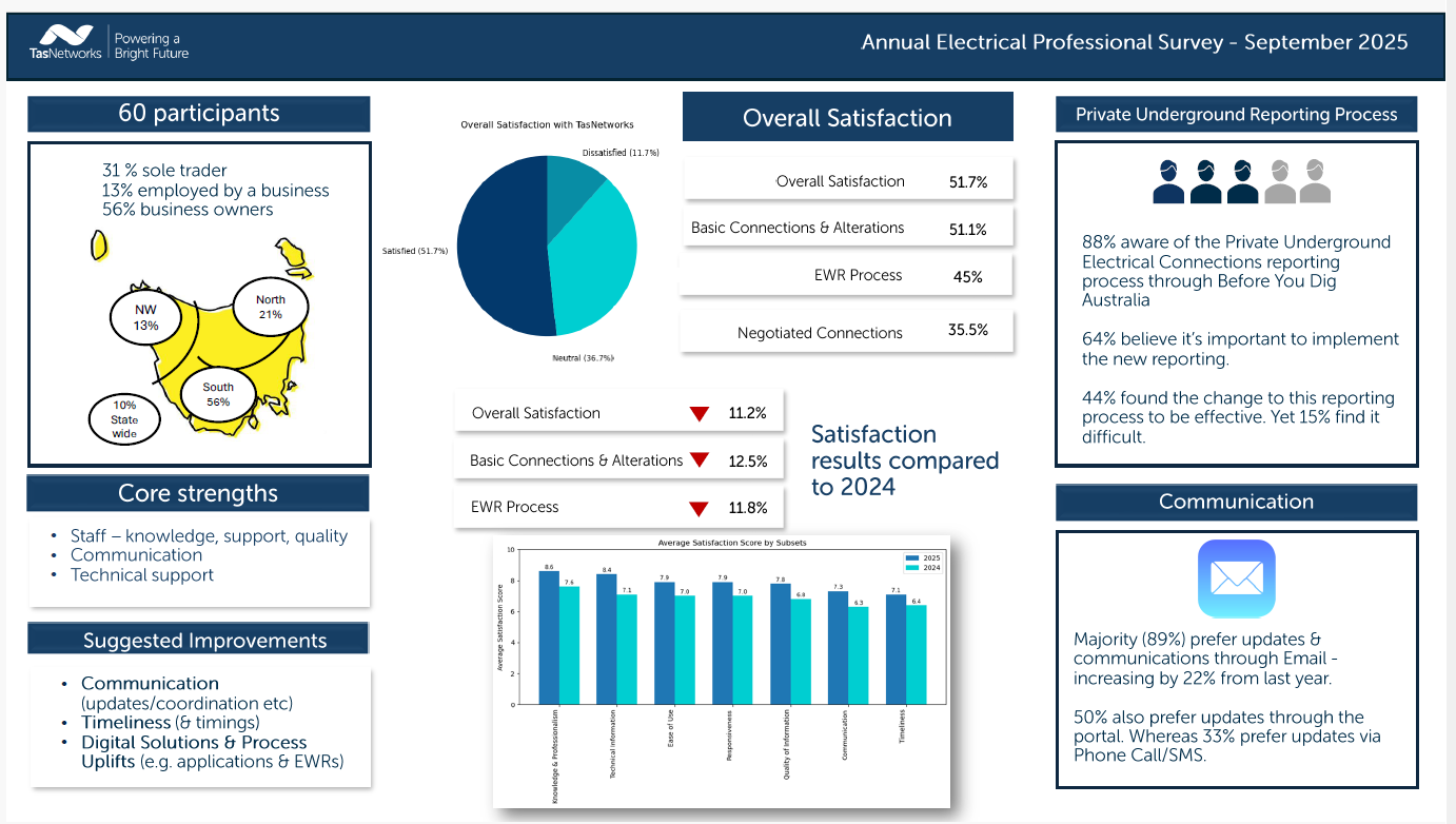 - 1 in every 2 electrical professionals state they are satisfied with TasNetworks’ current services and performance.